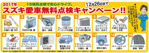 軽専門店の井上です! 毎年行っております、スズキの愛車無料点検!始っております、今年は12月26日までです(^○^) ~臨時休業のお知らせ~ 臨時休業のお知らせ