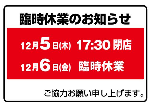 12月5日(木)17:30閉店 12月6日(金)臨時休業 ご協力お願い申し上げます。