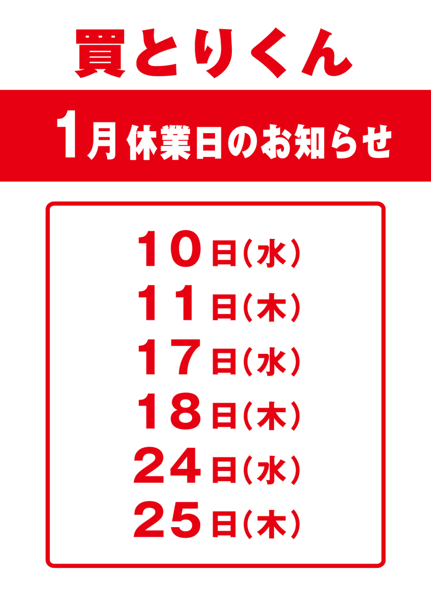2024-01-09 2024年1月 ウッドベル買とりくん 休業日のご案内です! お知らせ・ご案内 買とりくん休業日のお知らせ Share on Tumblr ウッドベル花岡店、ウッドベル新三雲店、ウッドベル三雲店は営業しております!